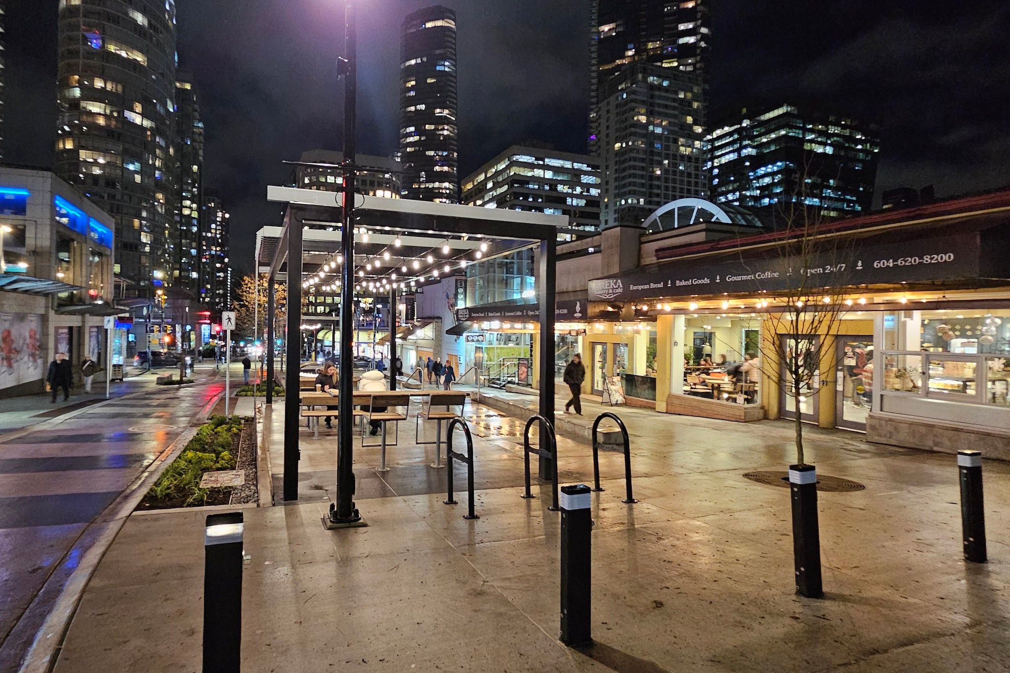 Public transport access has improved as well, with upgraded bus stops at the intersection and enhanced traffic signals. The closure of Bute Street to vehicle traffic between Haro Street and the laneway north of Robson Street allows better access for emergency vehicles while prioritizing pedestrians.