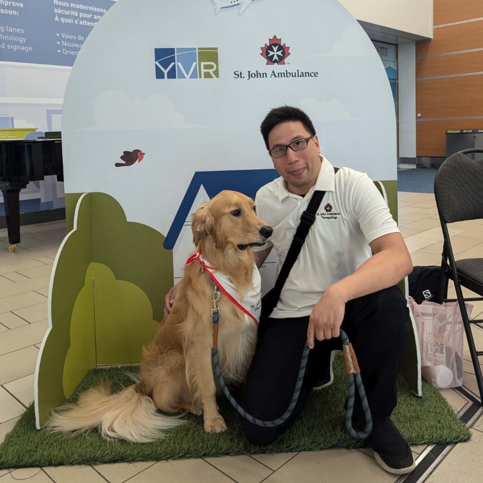 A Richmond paramedic, known as Fonzie, has taken his commitment to community service a step further by volunteering his time with his therapy dog, Dug. On his days off, Fonzie and Dug make regular rounds at Richmond Hospital and Vancouver International Airport (YVR), bringing joy and comfort to those in need.