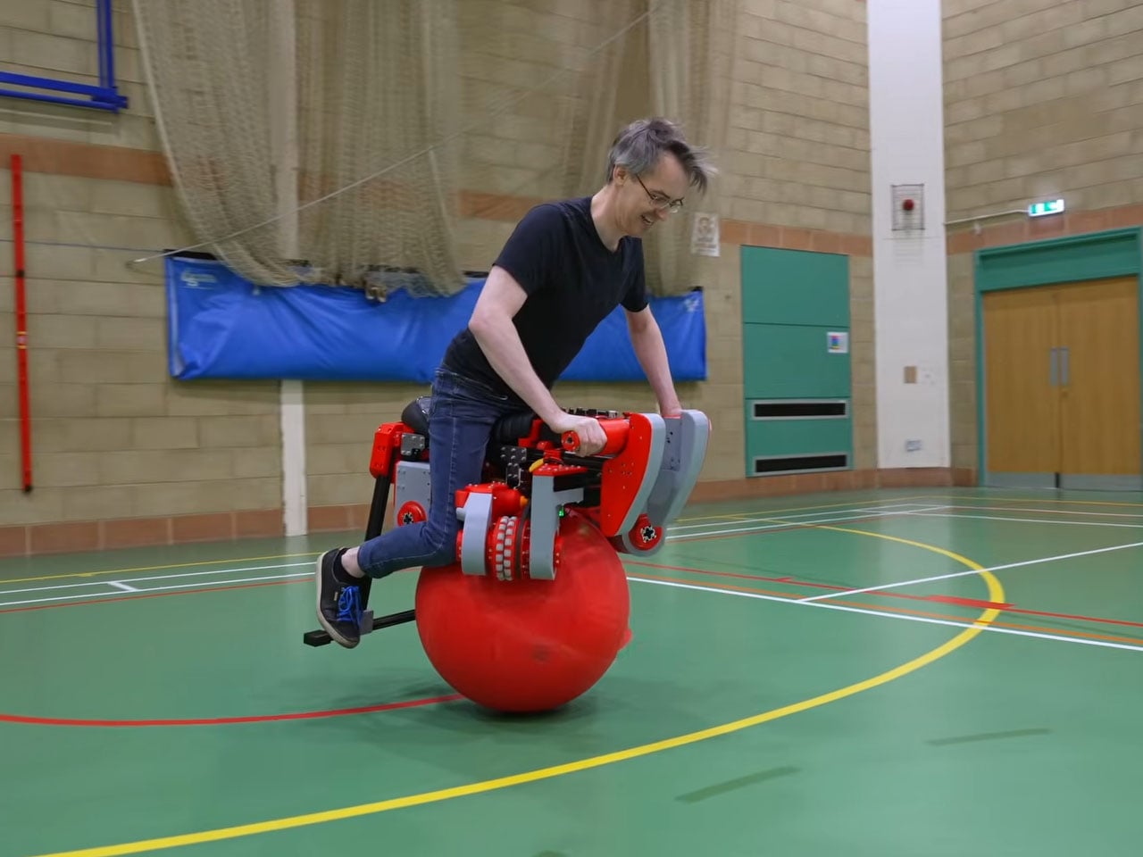 The One-Ball Bike features a striking red spherical ball, approximately 2 feet in diameter, which supports the bike and rider. Surrounding this sphere are three omnidirectional wheels arranged in an equilateral triangle. Each wheel is powered by a motor capable of propelling the bike forward, backward, or sideways. The wheels also include two rows of smaller passive rollers, which facilitate smooth movement and distribute weight evenly across multiple points of contact.