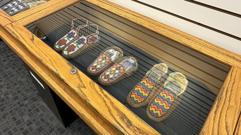 The collection now on display consists of 13 handmade moccasins, primarily crafted by Woodland Cree artisans and dating back around 30 years. These pieces showcase various designs, with some featuring geometric patterns and others adorned with floral motifs. “It’s all good quality stuff,” Robertson noted, highlighting that all the collars are fully beaded. “These are the real McCoys. This is the kind of thing that everybody’s great grandma used to wear.”